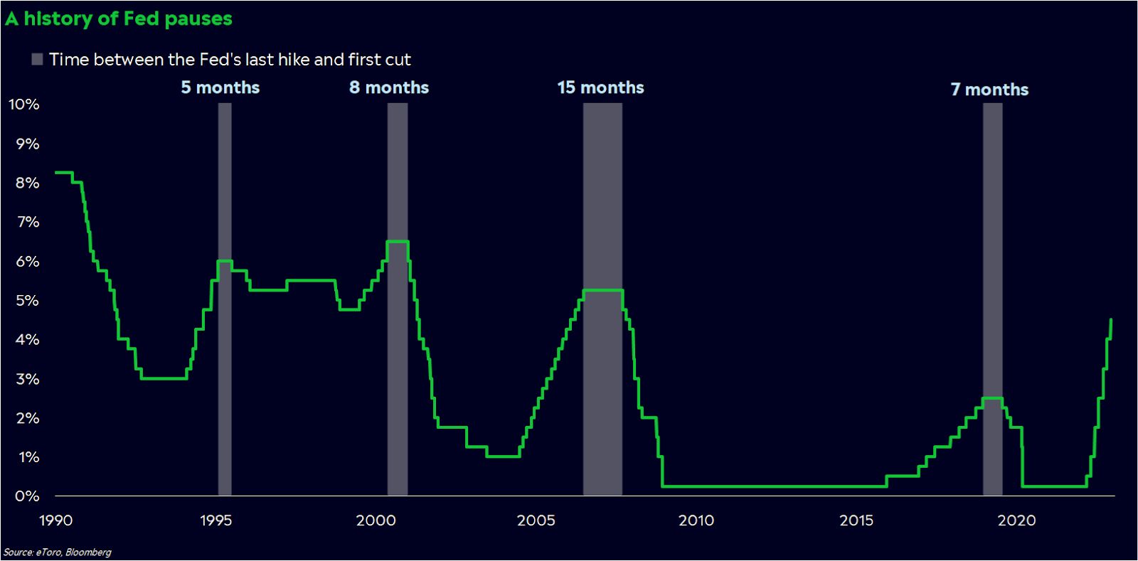 De aandelenbeurs kan in de economische cyclus gezien worden als een vroege indicator. Een aanzienlijk deel van alle beleggers handelt opportunistisch en wil niets liever dan kopen op de bodem van de economische groei. Dalende lange rentes geven hun het teken dat de bodem nabij is. Zij weten ook dat het, na een periode van renteverhogingen door de Federal Reserve, historisch gezien gemiddeld zo’n negen maanden duurt voordat het beleid weer wordt versoepeld (zie grafiek). Centrale bankiers zelf zijn veel voorzichtiger en willen zeker zijn dat de inflatie onder controle komt. Door speculatieve beleggers die alvast de gok wagen uit angst om straks te laat te zijn, was er in januari daardoor sprake van een heuse ‘fear of missing out’-rally. De AEX Index steeg bijvoorbeeld met maar liefst 8%.