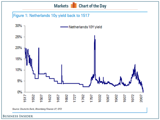 Business Insider publiceerde onlangs bijgaande langste rentegrafiek die er in de wereld bestaat, van de rente op Nederlandse staatsschuld. Sinds 1517 is die nog nooit zo laag geweest.