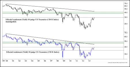 Figuur 1 laat een maandgrafiek zien vanaf 1999 met bovenin het rendement op US Treasuries ($) met een gemiddelde looptijd van 10 jaar en onderin het rendement op US Treasuries ($) met een gemiddelde looptijd van 30 jaar. Wij gaan er vanuit dat 2014 in het teken zal staan van een rentestijging die de Amerikaanse lange rente in de buurt gaat brengen van de in de grafiek getekende dikke horizontale groene lijnen. Voor beide looptijden betekent dit dat er nog een rentestijging in het vat zit van ongeveer 100 basispunten (1%). Belangrijker is echter dat als wij gelijk krijgen, de lange termijn dalende trend voor de 30-jarige rente in de VS wordt gebroken. En dat zou betekenen dat de tendens van almaar dalende renteniveau’s in de VS in elk geval op het punt staat om gebroken te worden. Een nieuwe fase van langdurig stijgende renteniveau’s heeft zich dan aangediend.