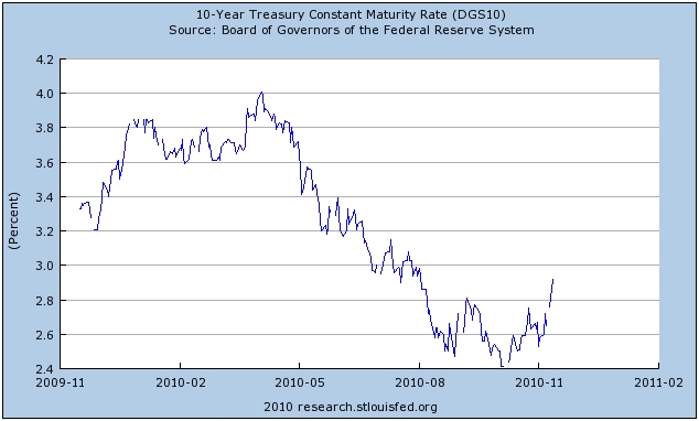 Hoe komt dat? Wordt er extra geld in de economie gepompt op een moment dat het toch al beter gaat; de detailhandelsverkopen stegen in oktober met 1,2% m-o-m onverwacht sterk. En heeft voorzitter Bernanke last van slechte timing (waar Centrale Banken toch al vaak onder gebukt gaan)? Of weet de Fed meer dan wij en is deze actie nodig om deflatie te voorkomen? In eerste instantie denken de obligatiemarkten anders en wordt juist inflatie gevreesd, waardoor de rente oploopt. Of speelt iets anders een rol, namelijk de financierbaarheid van de overheidstekorten?
