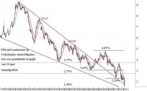 In figuur 1 vindt u het effectieve rendement van 10-jarige Nederlandse staatsobligaties op maandbasis sinds 1987.