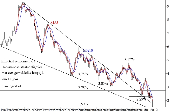 Het meest logische scenario is dat de weerstand op 2,29% op kortere termijn zal worden gebroken. Daarna ligt er een tweede weerstand op de weg omhoog op 3,05%. Een daling zou dan kunnen worden verwacht die echter niet door de steun op 2,29% zal vallen. Daarna zou een opmars kunnen beginnen waarbij in ieder geval het niveau van 3,75% zal worden bereikt. Uitgaande van het verleden zou dit een periode kunnen bestrijken van 6 jaar, waarvan twee jaar zijn verstreken. Dit scenario valt wonderwel samen met de uitspraken zoals gedaan hierboven onder het fundamentele gedeelte van dit artikel.