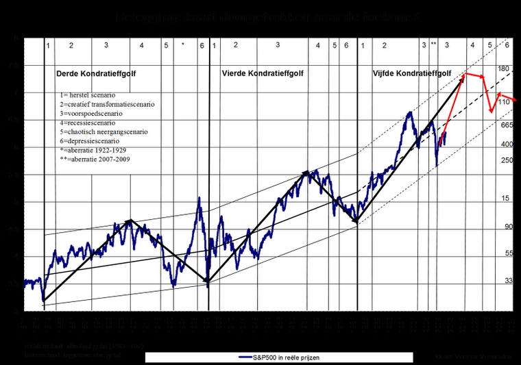 Maar… binnen zo’n supergolf komen andere golfbewegingen voor, bijvoorbeeld een Juglar-cyclus (conjunctuur-cyclus) van 7-12 jaar en in de V.S. bestaat een vierjaarlijkse presidentiële verkiezingscyclus. Daarnaast kunnen de beurzen nog andere, grillige patronen vertonen. In de bovenstaande kaart wordt bijvoorbeeld gesproken van de aberratie 2007-2009, om de forse daling van de S&P 500 in die periode maar een naam te geven.