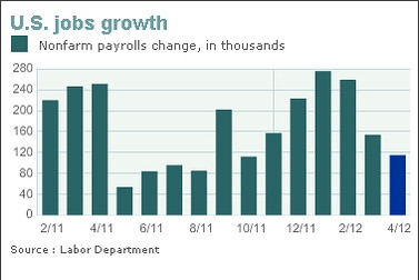Zo haalden de tegenvallende werkgelegenheidscijfers in Amerika van afgelopen vrijdag de in 2012 opgebouwde hoop op een steeds sterker wordend herstel weer onderuit. Het aantal nieuw-gecreëerde banen per maand valt tegen: zie grafiek.