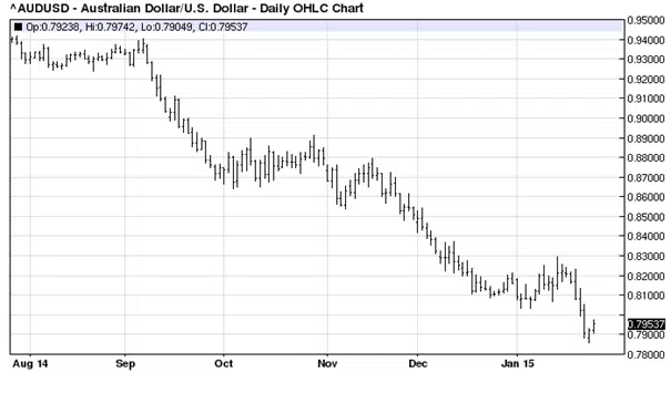 De Aussie is in de afgelopen zes maanden met 16% gekelderd naar het laagste niveau sinds 2009. De Australische bankgouverneur Glenn Stevens verwacht dat de daling aanhoudt. Volgens zakenbank Societe Generale is Australische dollar de volgende dominosteen die gaat vallen. De munt is dit jaar minder gedaald dan de euro en de valuta’s van Denemarken, Canada en Noorwegen.