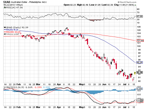 Bi j het nemen van die beslissing zullen de centrale bankiers met meer dan een schuin oog naar de economische ontwikkelingen in China kijken. Dat land is verreweg de belangrijkste handelspartner voor de Australiërs. En de berichten uit dat land zijn allesbehalve geruststellend. Volgens de statistieken zal het land dit jaar een geruststellende 7,5% groeien. De vraag is of dat ook gaat gebeuren. De Chinese minister van financiën heeft onlangs in New York verklaard, dat wat hem betreft een groeipercentage van 6,5% meer dan voldoende is. Dat moge voor China zo zijn, maar het is ronduit slecht nieuws voor Australië. In juni daalden de Chinese importen voor de tweede maand op rij en gelet op de uitlatingen van de minister hoeft daar op korte termijn geen verbetering in te komen!