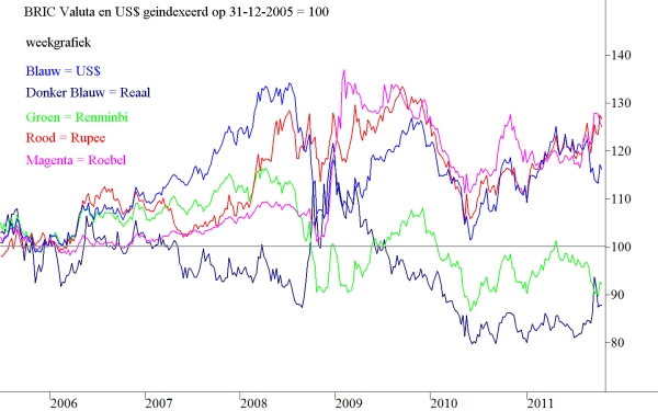 Een belangrijkere conclusie is de volgende. Alle vier de valuta zijn behoorlijk risicovol. Maar dat risico is niet gelijk verdeeld. In 2008, ten tijde van de kredietcrisis, daalden de Reaal, de Rupee en de Roebel alle drie in waarde (in de grafiek zijn deze drie sterk opgelopen in die fase, hetgeen betekent dat de € op dat moment sterker werd). De $-grafiek daarentegen en de daaraan gekoppelde Renminbi daalden sterk in de figuur hetgeen betekent dat deze twee valuta juist sterker werden ten opzicht van de € (men moest er dus meer €’s voor betalen). Er trad dus een vlucht naar $’s op. Dat is al lang zo en wordt verklaard uit het feit dat ten tijde van financiële crises beleggers uit niet-$ beleggingen stappen en terug naar hun eigen valuta-eenheid keren waarbij de $-gebaseerde beleggers nog altijd in de overgrote meerderheid zijn. En hierbij moet niet alleen gedacht worden aan Amerikaanse beleggers, maar ook aan vrijwel elke belegger die vanuit grondstoffenlanden zijn of haar vermogen heeft opgebouwd, waartoe de olierijke Arabische landen maar ook Rusland behoren.