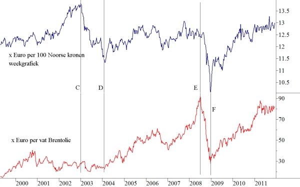 Daarnaast hebben wij 4 verticale lijnen in de figuur getekend. Deze lijnen (bij respectievelijk C, D, E en F) zijn geplaatst op punten waar de koers van de Noorse kroon van trendrichting veranderde. De grafiek bevestigt dat het goed is voor de kroon als de olieprijzen (in €’s) stijgen. Maar het is geen correlatie van 100%. Zo steeg de waarde van de kroon in de periode voor 2003 terwijl de olieprijzen vanaf medio 2000 tot in 2003 juist daalden. De kroon haalde die daling vervolgens wel in, maar niet in dezelfde mate als de olieprijzen waren gedaald.