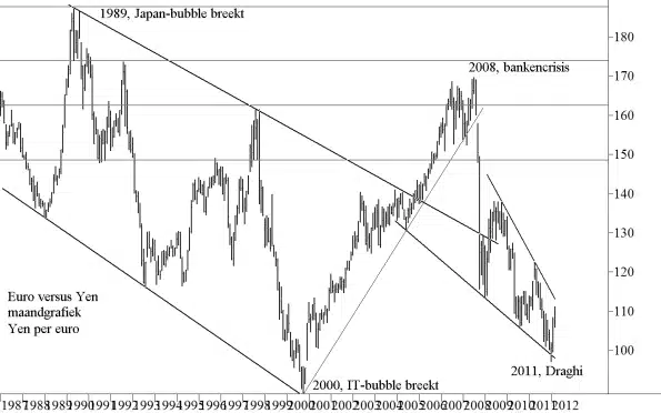Maar in 2008 knapte de hypotheekbubbel in de V.S. en brak de bankencrisis los gevolgd door de schuldencrisis in Europa. Met name de Amerikaanse en de Europese banken en in hun kielzog de economie van beide gebieden kwamen onder druk te staan en de trend van de ¥en keerde abrupt. De ¥en was plotseling een veilige haven en won al in 2008 flink aan kracht. Maar daarna ontstond een dalende wedge waarbij de ¥en per saldo voortdurend sterker werd t.o.v. de €, totdat de ECB als nieuwe voorzitter Mario Draghi naar voren schoof. Hij kwam vrij snel na zijn aanstelling met de 3-jaars faciliteit en pompte zo meer den € 1.000 miljard in de Europese economie. En en passant behoede hij europa (in ieder geval voorlopig) voor een forse escalatie van de (Griekse) schuldencrisis.