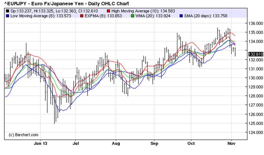 Het is nog maar net een jaar geleden, dat bijna niemand nog een cent voor het voortbestaan van de euro gaf. De munt leek ten onder te gaan aan de aanhoudende crisis in de periferie van Europa. Maar het kan verkeren. Aan het einde van de maand oktober van dit jaar was de euro misschien wel de sterkste munt ter wereld. Uit onderzoek van Bloomberg bleek, dat de munt van de eurozone in de loop van 2013 6,7% duurder was geworden ten opzichte van een mandje van negen concurrerende valuta’s. Ten opzichte van de dollar was de munt 4,6% duurder geworden en ten opzichte van de Japanse yen zelfs 17%. Op 22 oktober van dit jaar bereikte de euro het hoogste niveau ten opzichte van de yen in meer dan 4 jaar. Op die dag gingen er 1,3551 yen in de euro.