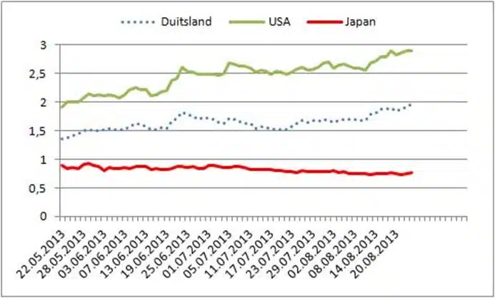 In anticipatie op het eind van de Quantitative Easing hebben de obligatiemarkten hun conclusies getrokken. In die drie maanden sinds 22 mei is het rendement op 10-jaars staatsleningen in de Verenigde Staten snel gestegen en veel sneller dan in Europa (Duitsland), met bijna 1 procentpunt tegen over 0,6 punt. In Japan is de rente in die periode iets gedaald (0,14 punt), terwijl de yen zelfs iets zwakker werd (2%).