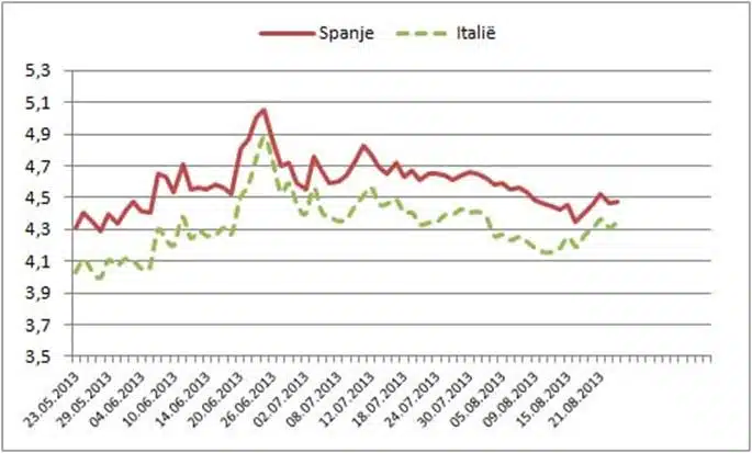 Kan de politiek misschien nog een bijdrage aan de verklaring leveren? Tot aan de septemberverkiezingen in Duitsland lijkt de Europese schuldencrisis een zomerslaap te houden. De problemen rond premier Rajoy in Spanje en ex-premier Berlusconi in Italië kunnen de markten niet in opwinding brengen. Waar de Duitse rente oploopt wordt het verschil in de tienjaars rente met Italië en Spanje zelfs kleiner: zie grafiek.
