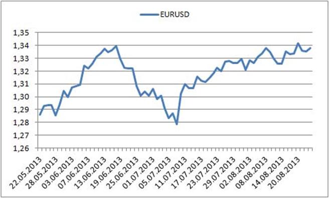 Fout: in werkelijkheid is de dollar sinds de aankondiging van de tapering op 22 mei jl. alle kanten opgegaan, maar per saldo zwakker geworden ten opzichte van de euro.: zie grafiek.