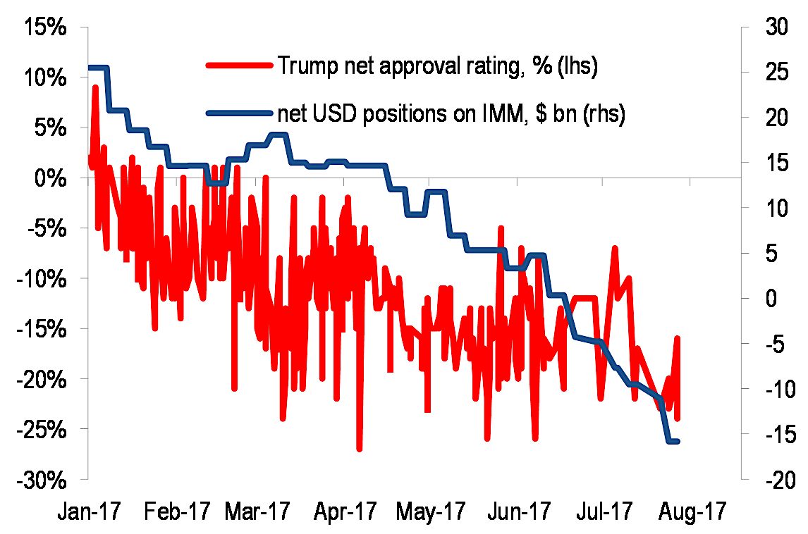 Beleggers zien in toenemende mate de voortdurende nerveusiteit van Trump’s als een groot probleem voor de vooruitzichten van zijn pro-groei agenda. De recente stijging van de afkeuring van Trump en de waarde van de dollar, zoals blijkt uit de onderstaande grafiek, maakt dat duidelijk.
