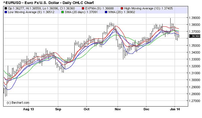 De euro eindigde 2013 in een positieve stemming ten opzichte van de dollar. De koers steeg uit tot boven $ 1,38 in de euro. De sterke prestatie van de gezamenlijke munt is te danken aan de stroom van goed nieuws, dat uit de eurozone kwam aan het einde van het jaar. De inflatie leek eindelijk licht op te lopen en the Eurozone Economic Confidence kwam op 98,5 uit, op het hoogste niveau sinds augustus 2011. Toen bedroeg het cijfer 99,0.