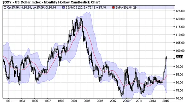 Een negatieve factor is de zwakte van concurrerende valuta’s zoals de euro en de yen. Zo verliest de euro steeds meer terrein op de dollar. In oktober van 2014 was de euro nog $ 1,30 waard, nu is dat nog slechts $ 1,10. De zwakte van de euro is aan meerdere factoren toe te schrijven. Zo maakt banpresident Draghi om 22 januari 2015 plannen bekend om maandelijks voor een bedrag van € 60 miljard aan Europees schatkistpapier te gaan opkopen. Als die plannen eenmaal werkelijkheid worden, dan zal dat voor een langere periode een drukkend effect hebben op de euro.