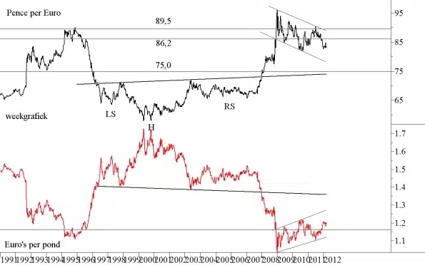 In figuur 1 ziet u de koersontwikkeling van het pond (£) ten opzichte de euro (€). Bovenin (de zwarte lijn) ziet u het aantal pence dat u voor een € krijgt en onderin (de rode lijn) hebben wij het aantal euro’s weergegeven, dat u per £ heeft kunnen krijgen / krijgt (de omgekeerde grafiek van de zwarte lijn). Bij H in 2000 begon de koers van het £ weer te dalen. Dit resulteerde in een enorme kopschouderformatie, die begin 2008 werd bevestigd met een uitbraak. Het gaat hier om een correctiepatroon. Grafieken die veel verder terug gaan dan figuur 1 laten zien dat het pond ten opzichte van de DM en de Gulden door de jaren heen is gedaald. In deze figuur hebben wij als voorloper van de € de Gulden genomen. De zwarte lijn komt dus van een veel dieper niveau als u verder terug gaat dan 1991.