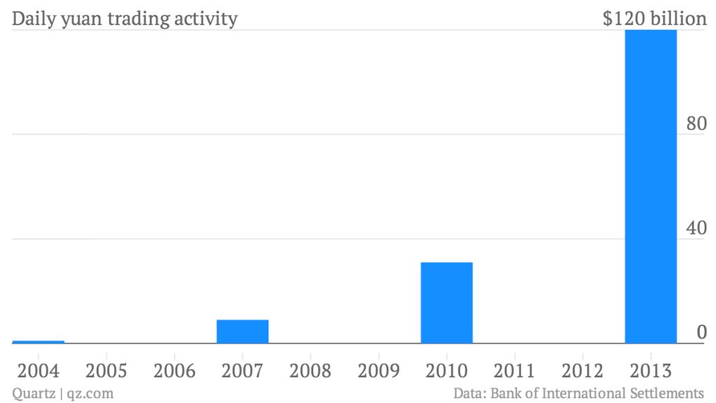 De handel in de Chinese yuan is de afgelopen drie jaar fors gestegen. De valuta wordt driemaal zoveel op de wereldwijde markten verhandeld als in 2010. Dagelijks wordt er nu $120 miljard in de yuan omgezet. Drie jaar geleden bedroeg dit slechts $34 miljard. De Chinese munt is daarmee gestegen van de zeventiende plek naar de negende plaats op de lijst van de meest verhandelde valuta’s ter wereld. Daarmee kwam de valuta boven de kiwi (Nieuw Zeelandse dollar) die op plaats 10 staat. De Zweedse kroon werd uit de top 10 gestoten. Dat blijkt uit een overzicht van de BIS, de toonaangevende club van centrale banken. De opmars van de yuan is volgens de BIS “in lijn met de toegenomen pogingen om de Chinese munt te internationaliseren”.