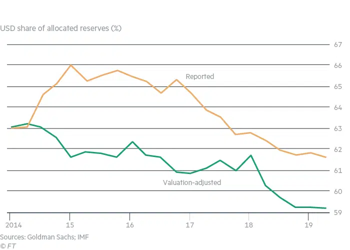 Toch, zo zeggen ze bij Goldman Sachs, zijn de fundamenten voor de multipolaire wereld al wel geldig. De bankiers constateren dat dollarreserves in 2017 en 2018 met 4 procentpunt afnamen, maar dat vooral meer renminbi’s en Japanse Yens gekocht werden. Daar past weer wel een kanttekening bij. Vooral landen die een moeizame relatie met Washington hebben, zijn op zoek naar een alternatief voor de dollar. In 2018 waren het vooral de Russen die renminbi’s kochten. Dit jaar zijn het vooral Brazilië en Chili.