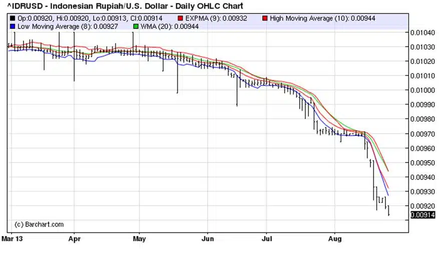 Sinds de Fed in april van dit jaar zijn voornemens wereldkundig maakte, heeft de paniek in Indonesië toegeslagen. De nationale munt, de roepia, is sinds april naar het laagste niveau gedaald ten opzichte van de dollar sinds april 2009. De munt presteert daarmee het minst van alle belangrijke Aziatische valuta’s.