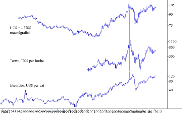 In de figuur ziet u boven elkaar de koersontwikkeling van de C$ versus de US$, de koersontwikkeling van Tarwe in US$ per bushel op de beurs van Chicago (CBOT spot) en de koersontwikkeling van Brentolie in US$ per vat, alle drie op maandbasis. Onze database voor de prijzen van Tarwe loopt slechts tot eind 2000 terug.