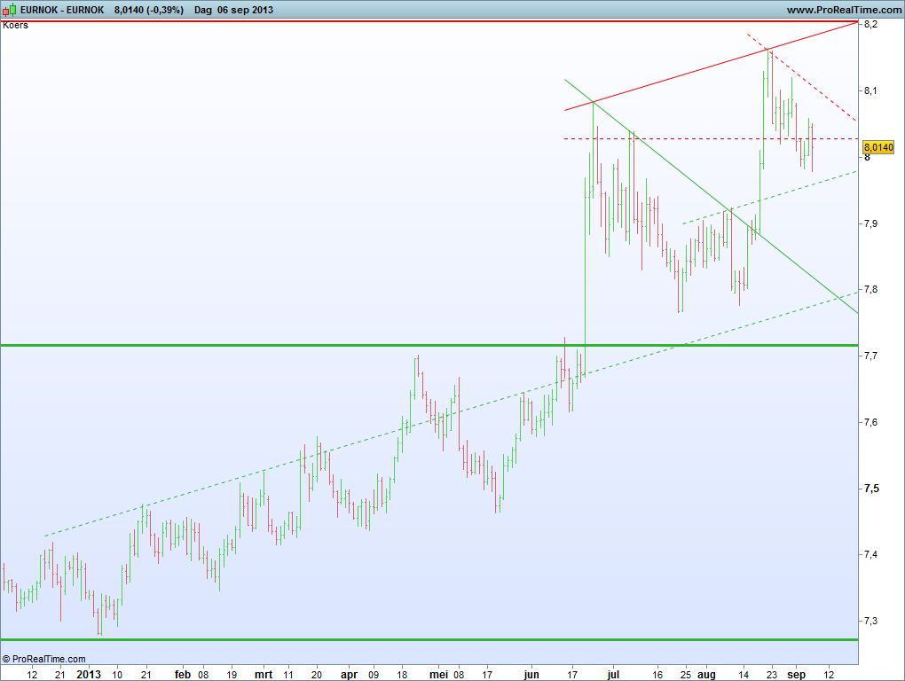 Op 22 augustus werd de hoogste koers van dit jaar gezet op 8,1643 na een felle uitbraak. De koers lijkt nu terug te keren in eerste instantie naar 7,960. Een belangrijke steun vinden wij op 7,717 euro per Noorse Kroon. Beleggers kunnen zolang dat niveau niet geschonden worden bij zwakte kopen. Lange termijn beleggers kunnen nu al instappen. Weerstand vinden wij op 8,2051.