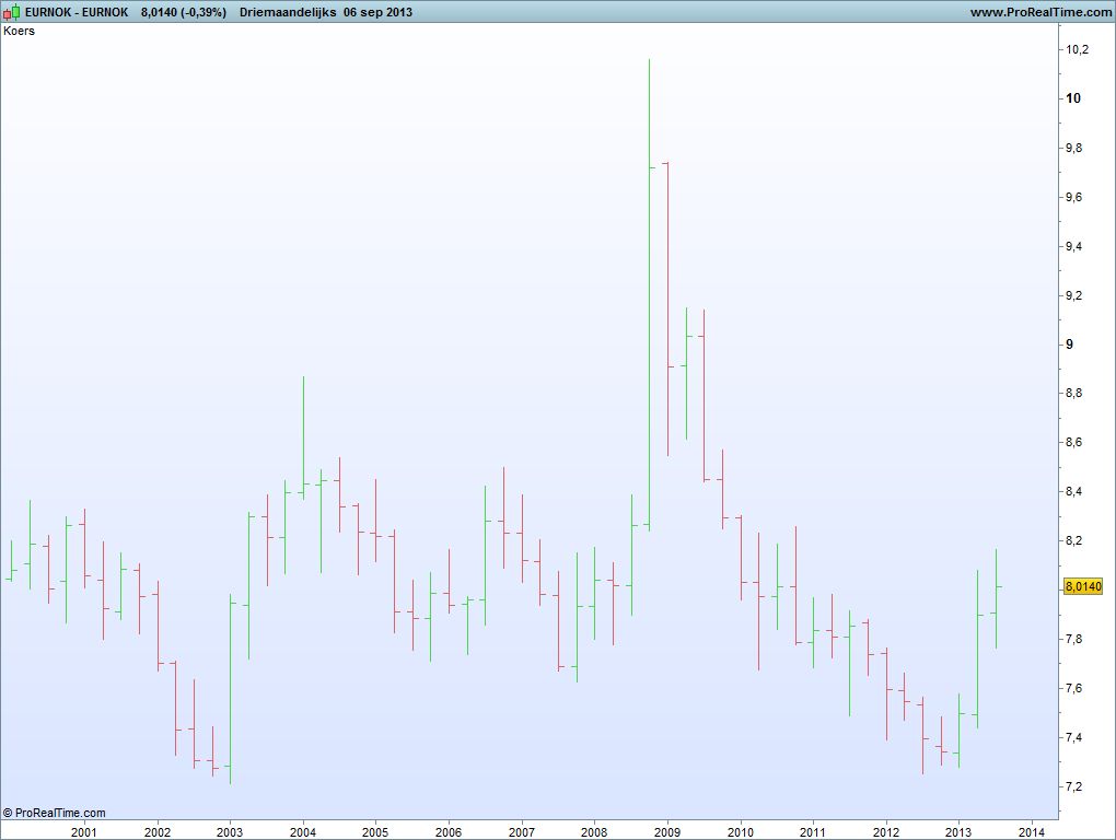 Noorwegen is zeer welvarend met een eigen munt, de Noorse Kroon. De welvaart van het land is vooral afhankelijk van de export van olie en de prijs daarvan wordt niet beïnvloed door de koers van de eigen munt.  Onze columnist Gijsbrecht K. van Dommelen heeft op onze site al een artikel aan deze valuta gewijd. In een periode van dertien jaar heeft de Noorse Kroon per saldo zijwaarts bewogen ten opzichte van de euro. In januari 2000 koste 1 euro, 8,0375 kronen. Momenteel bedraagt die verhouding 8,0215. Een record werd bereikt met een verhouding van 10,1596 in oktober 2008. Sindsdien heeft de Noorse Kroon weer terrein herwonnen en en heeft de EUR/NOK een laagste stand bereikt van 7,2503 in juli 2012 toen de eurocrisis een hoogtepunt bereikte (zie onderstaande grafiek).