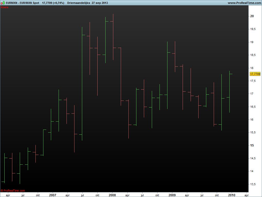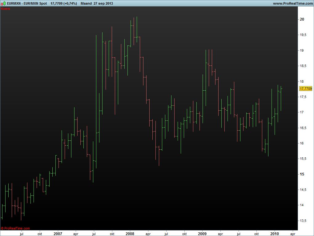 De euro stond in mei 2006 op een dieptepunt van 13,5476 peso. Sindsdien is de opmars begonnen naar een record van 20,0896 in november 2009, een stijging van 48%. Ook ten opzichte van de peso moest de Europese eenheidsmunt terrein inleveren vanwege de schuldencrisis. Er werd een hogere bodem gezet op 15,2776 in juni 2010. Daarna vervolgde de euro de opmars ten opzichte van de Mexicaanse peso (huidige koers: 17,8785).