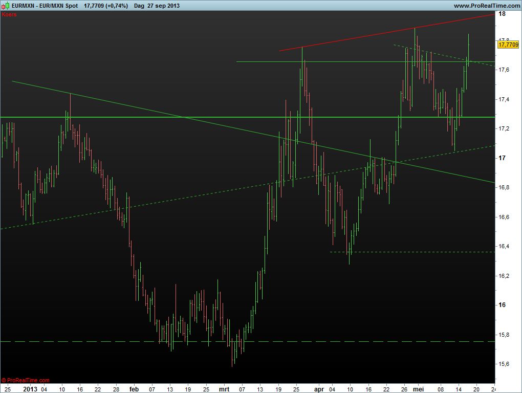 De daggrafiek toont een zelfde beeld. De EURMXN is uitgebroken en op weg naar naar weerstanden.
