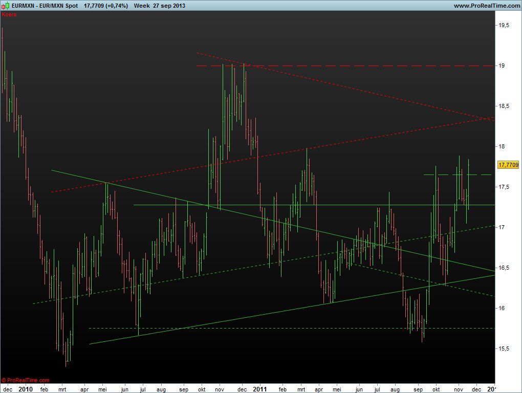 De tweede en belangrijkste oorzaak zijn plannen van de Amerikaanse centrale bank. De Fed is voornemens om de monetaire stimulering ter waarde van $ 85 miljard geleidelijk te gaan afbouwen. Mede daardoor is de Mexicaanse munt verzwakt, zie de weekgrafiek: