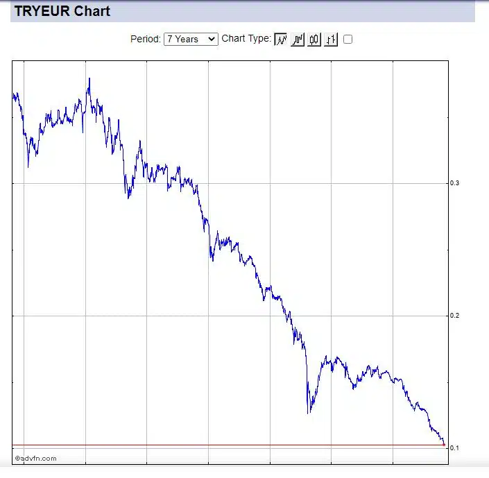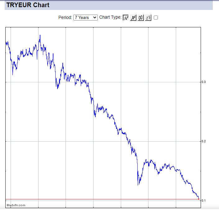 Hieronder ziet u de Turkse lira in termen van de euro en kunt u zien hoe scherpt de daling is.
