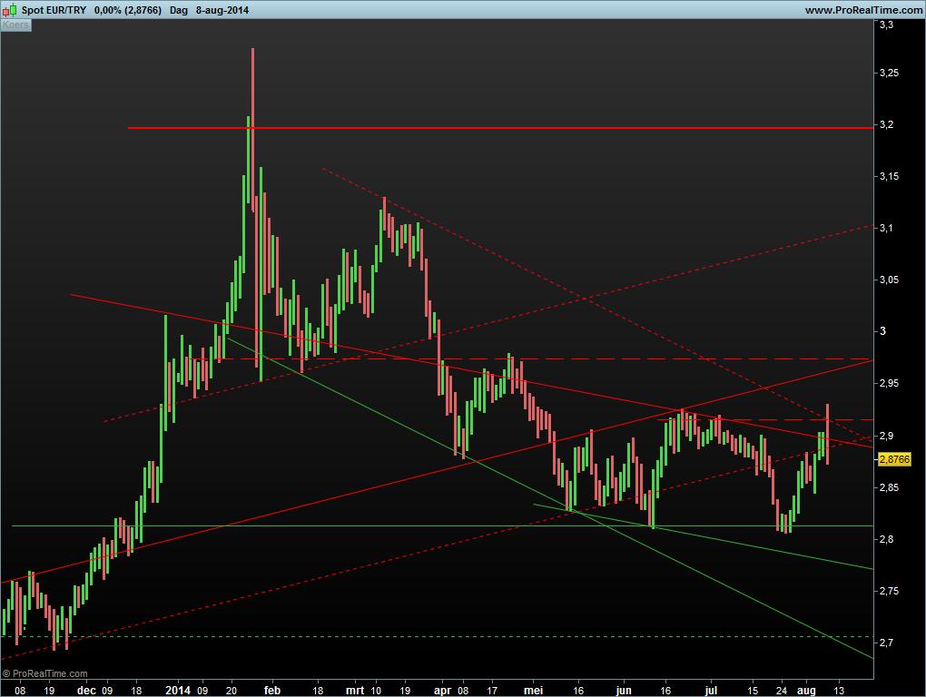 Het is nu ruim een jaar geleden waarin ik een artikel schreef over de turkse lira. Wellicht gaat u binnenkort op vakantie of bent u al geweest. De vraag is dan: moet je de turkse lira kopen? In het artikel van vorig jaar schreef ik: “Derhalve is de EURTRY koopwaardig en kan een verdere verzwakking worden verwacht van de Turkse Lira. Eerste koersdoel is rond 2,60 lira per euro. Steun mag verwacht worden op 2,55. Daarna op 2,4810 en 2,31 en ultieme steun op 2,18. Wel is waakzaamheid geboden omdat de top van 2011 in zicht is. Stop kan gezet worden op 2,48”.