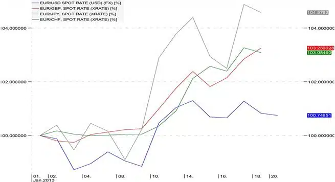 In de onderstaande grafiek worden koersen van de US-dollar, het Britse pond, de Japanse Yen en de Zwitserse frank weergegeven, waarbij de koers voor alle vier per 1 januari 2013 op 100 is gesteld.