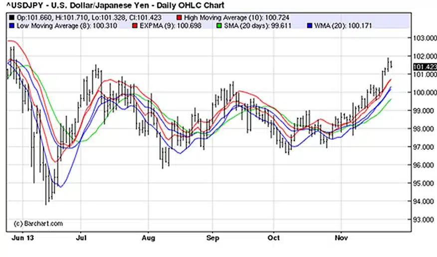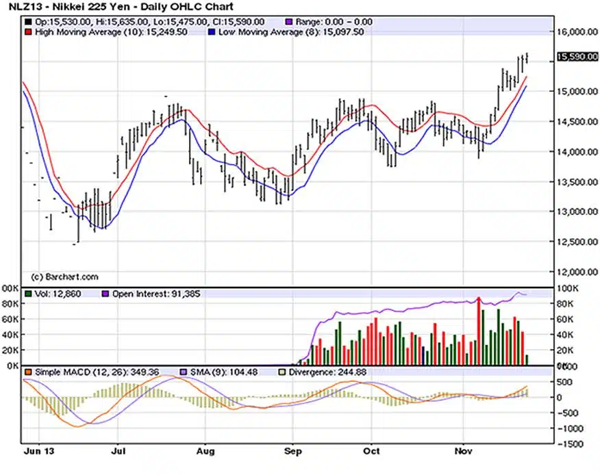 De vraag is daarom of Japanse bedrijven in 2014 opnieuw zullen kunnen profiteren van een verder verzwakkende yen. Dat is waarschijnlijk wel het geval, zij het dat er enige slagen om de arm moeten worden gehouden. De Japanse overheid is voornemens om in 2014 een ietwat verkrappender beleid te gaan voeren. Het is de bedoeling, dat er in april van 2014 een verhoging van de belasting op consumptie komt. Bij Credit Suisse rekenen ze daarom wel op enige vertraging van de groei, maar schatten ze die nog steeds in op 2,2% tegen 2,5% voor 2013. Die zal vooral te danken zijn aan groeiende binnenlandse investeringen en verdere exportsuccessen. Daar komt nog bij, dat nog in het eerste kwartaal van 2014 de BoJ waarschijnlijk een verdere verruiming van het monetaire beleid zal gaan aankondigen. Dat gaat van ¥ 7,5 biljoen naar ¥ 10,5 biljoen per maand. Ook dit zal de groei ondersteunen. Of dit de laatste verdere verruiming zal zijn, is de vraag. Om hun doet te bereiken zal het duo Abe/Kuroda er niet voor terugdeinzen om nog grotere stappen te gaan nemen. Daarom gaan ze er bij Barclays Bank vanuit, dat de yen onder invloed van dit beleid van de BoJ verder in waarde gaat dalen en wel met minimaal 8%. Dat betekent dat in 2014 de yen in relatie tot de dollar kan dalen naar een niveau van ¥ 110 tot ¥ 115 in de dollar.