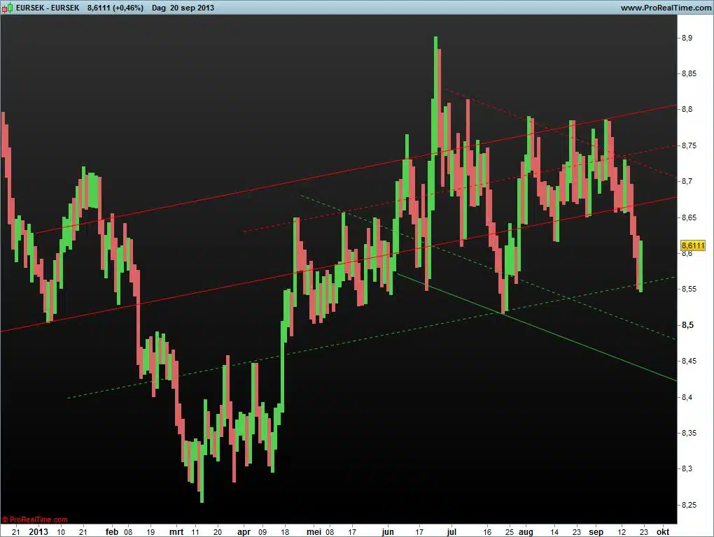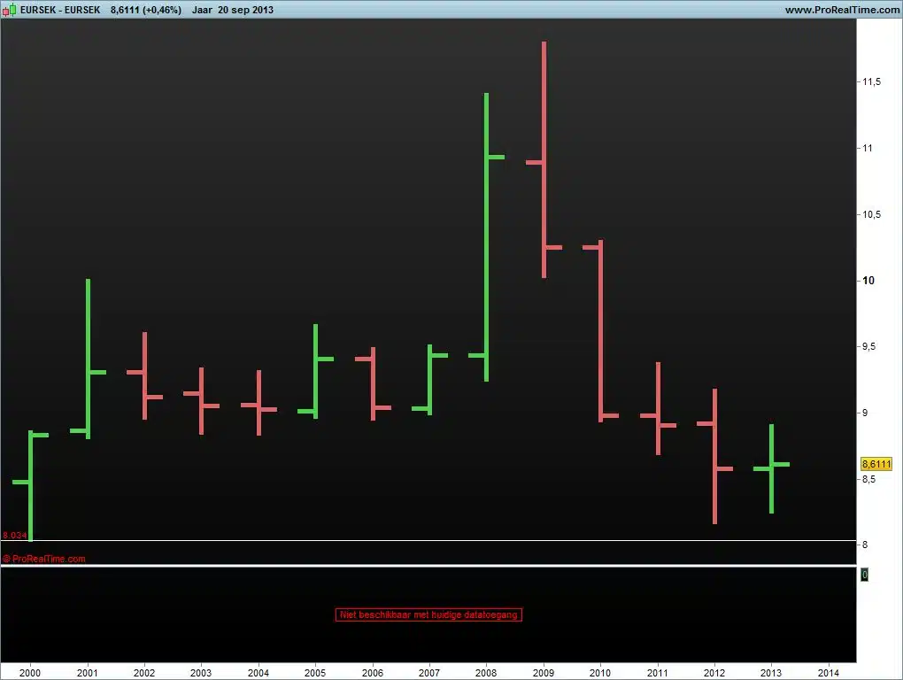 In 2000 bereikte de euro tegenover Zweedse kroon de laagste stand van 8,0434. Daarna begon een opmars tot een record van 11,7903 in 2009. (een winst van ruim 46%!) Sindsdien verliest de Europese eenheidsmunt fors terrein tot de huidige stand van 8.6102. Mooi is dus te zien dat het sentiment ook omgeslagen is. De euro tegenover de Zweedse kroon bevindt zich dus in een dalende trend sinds 2009.