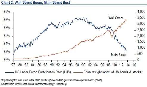 De twee basisstrategieën van de centrale banken, kwantitatieve verruiming (QE) en het aanhouden van de nulrente – telkens met de zogezegde bedoeling om de groei te herstellen en zowel inflatie als een welvaartseffect te creëren – hebben slechts negatieve gevolgen voortgebracht. Hun acties hebben namelijk geleid tot het ontstaan van omvangrijke aandelen- en vastgoedbubbels, waarbij grootbanken, beursgenoteerde multinationals en speculanten (allemaal “Wall Street”) enorm geprofiteerd hebben ten koste van de werkgelegenheid en het budget van gezinnen en kleine – of middelgrote bedrijven (samen is dat “Main Street”).