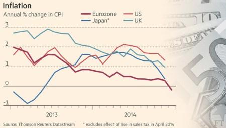 De ECB reageert hierop door de rente te verlagen.Als de ECB slaagt in de opzet om de inflatie te verhogen en de waarde van de euro te drukken is dat slecht nieuws voor de gemiddelde Europese huishouden. De maatregelen van de Japanse centrale bank (BoJ) hebben geleid tot meer inflatie maar de werkloosheid is niet afgenomen en de lonen zijn gestegen. De Japanse misère index(werkloosheid tezamen met inflatie) is op het hoogste niveau in 33 jaar!”