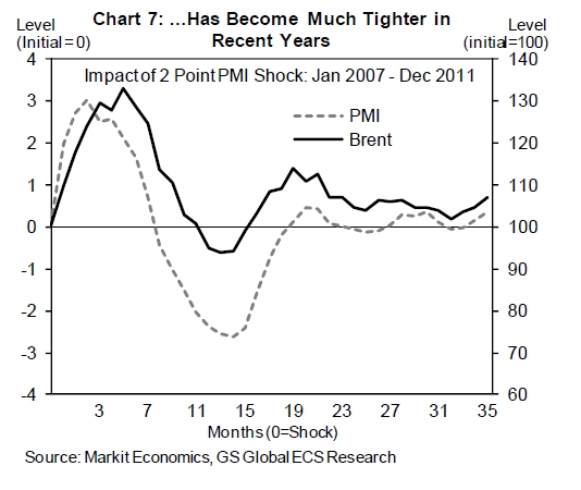 Niet alleen het kwakkelende fiscale en monetaire beleid is een rem op de groei, maar vooral de olieprijs, zo denkt Goldman Sachs. Olie is een onmisbaar, maar schaars goedje. De aanhoudende grote vraag uit vooral de opkomende markten overtreft met regelmaat de productie. Onder de huidige omstandigheden van krapte aan olie is er niet zoveel extra vraag nodig om de prijs omhoog te jagen. Zelfs de verwachting dat de economie verbetert, is al voldoende om de prijs omhoog te jagen (Fig. 2)! Een verbetering van de Index van Inkoopmanagers luidde een verhoging van de olieprijs in, die vervolgens het elan deed verpieteren en de economische activiteiten weer omlaag duwde.