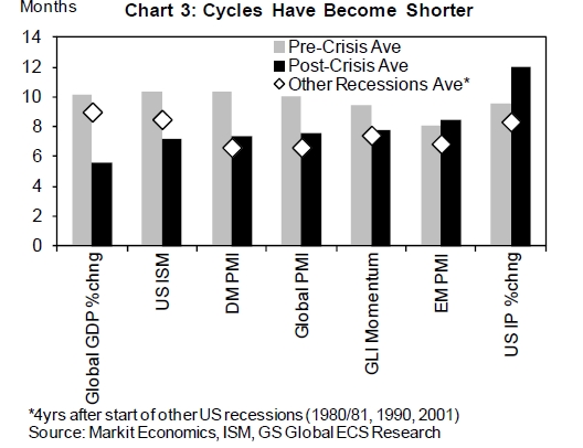 Dat werpt de vraag op of de economische cycli sinds de financiële crisis korter zijn geworden en derhalve in aantal toenemen. Bij Goldmans Sachs denken ze dat er inderdaad iets veranderd is om er meteen aan toe te voegen, dat er geen overtuigend bewijs is. Toch laat bijvoorbeeld figuur 1 zien, dat de cycli in de afgelopen jaren korter dan gemiddeld zijn geweest.