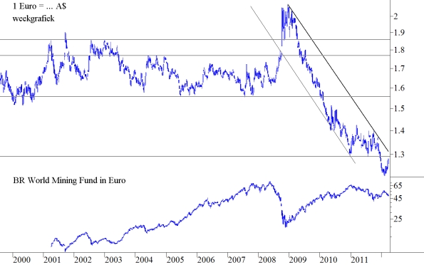 In figuur 3 hebben wij nogmaals de koers van de € ten opzichte van de A$ opgenomen, maar nu sinds 2000 en nu hebben wij eronder de koersgrafiek opgenomen van het Black Rock World Mining Fund genoteerd in €. Qua richting is duidelijk sprake van correlatie. Als de koers van het Mijnbouwfonds stijgt, dan wordt ook de A$ sterker. Sinds medio 2010 is er de klad gekomen in de prijzen van mijnbouwgrondstoffen in het algemeen en dit heeft ook geleid tot een hapering in de trend van de € versus de A$.