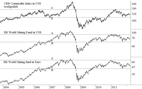 In de figuur hebben wij per koersgrafiek twee horizontale lijnen getrokken om de ontwikkeling met elkaar vergelijkbaar te maken. Lijn A loopt over de top uit 2010 en lijn B loopt onder langs de bodems uit 2010 en 2011. Opvallend is het verschil tussen de twee US$-grafieken en de €-grafiek. In de onderste curve (de €-grafiek) loopt lijn A ook langs de toppen die in 2007 en 2008 werden bereikt vlak voordat de bankencrisis op de effectenbeurzen losbarstte. In €-gemeten zijn de prijzen van delfstoffen in de periode 2009 – 2010 bijna helemaal tot aan het hoogste niveau hersteld.