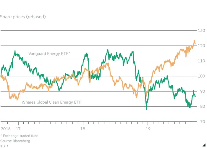 Het goede presteren van olie en gas staat haaks op de prestaties in de jaren ten tijde van de financiële crisis. Tussen 2008 – 2013 raakte ‘groen’ helemaal uit de mode. De eerder genoemde iShares Clean Energy ETF daalde in die jaren met maar liefst 80%. Maar dit jaar is alles anders. De oliemaatschappijen blijven achter ook al bieden ze beleggers een mooi dividend en zitten ze bovenop hun portefeuille. Meer en meer beleggers zijn huiverig om in te stappen nu onduidelijker wordt hoe deze bedrijven te waarderen. Wat zijn bijvoorbeeld hun voorraden nog waard?