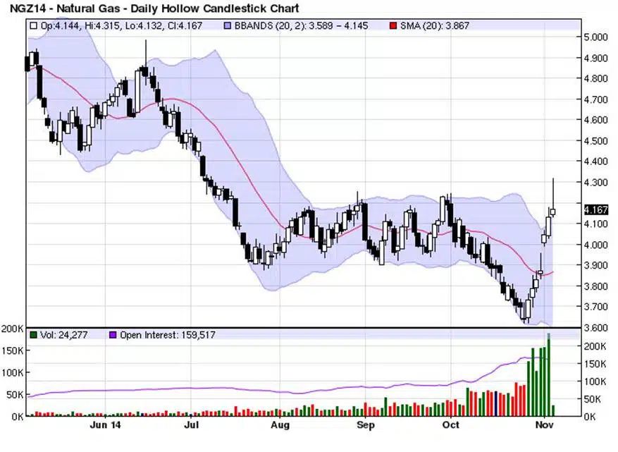 Na de strenge winter zijn de gasprijzen in snel tempo weer gedaald, maar nu is de winter weer in aantocht. De markt kijkt daarom met groeiende belangstelling naar de huidige gasprijs en naar de weersverwachtingen. Die prijs lag aan het einde van de maand oktober op $3.541 MBTU. Sindsdien zijn de weersverwachtingen omgeslagen. Volgens het meteorologisch bureau AccuWeather Inc. belanden de temperaturen in het oosten van de Verenigde Staten ver onder het gemiddelde en in een aantal staten zal de vorst dit jaar vroeg invallen.