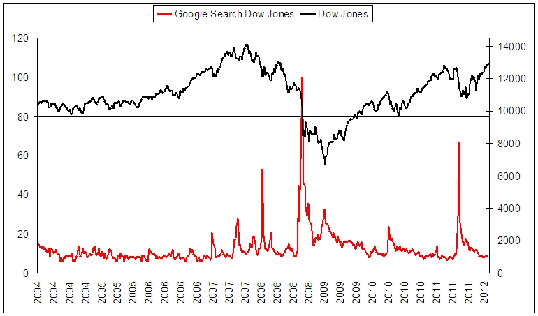 Niettemin was ik nieuwsgierig naar de vraag of er soms een vertraging was tussen het intypen van de zoekwoorden en de beurskoersen. Als de zoekwoorden eerst komen, kan dat immers een top voorspellen. Helaas, dat bleek niet het geval, het viel keurig samen met grote bewegingen. Bij het onderzoeken van de zoekwoorden ‘Dow Jones’ vielen vooral de uitschieters in oktober 2008 en augustus 2011 op. Ik had al een vaag vermoeden, maar toen ik de data van de Dow Jones in dezelfde grafiek opnam kreeg ik de bevestiging dat crash-achtige bewegingen zorgen voor een verhoogde zoekactiviteit. Zie hier.