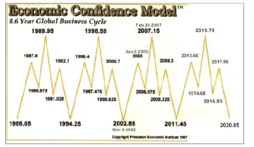 Voor wie Armstrong niet kent, nog even een korte introductie. Armstrong ontdekte hoe je het getal pi kon gebruiken in een bedrijfseconomisch model, door hem het Economic Confidence Model, ECM, genoemd. Dit model is niet gebaseerd op welke individuele markt dan ook. Niet op de Dow Jones, niet op de goudmarkt, niet op de obligatiemarkt etc. Het model vormt een weergave van eb en vloed van de kapitaalstromen in wereldwijd verband. Wanneer stroomt ‘hot money’ toe (vloed) en wanneer stroomt het hete geld weer weg (eb). Elk markt heeft zijn eigen model, echter het gebeurt regelmatig dat de individuele markten in de pas lopen met de draaipunten zoals het ECM dat aangeeft. Soms zelfs op de dag nauwkeurig. Maar zoals Armstrong ook zelf steeds aangeeft: leg niet een individuele markt naast de meetlat van het ECM en roep dan vervolgens: zie je wel, het werkt niet. Dat doe je het model absoluut te kort.