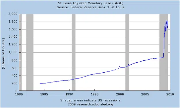 Veel van dat bijgedrukte geld heeft nu de status van basisgeld (Monetary Base), het zogenaamde M0-cijfer. In de grafiek hieronder zien we dat meer dan een verdubbeling van het basisgeld heeft plaatsgevonden.