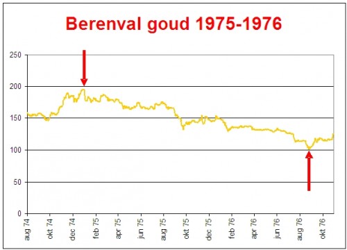 Wat ik in het interview vertelde was dat flinke tussentijdse correcties heel gebruikelijk zijn. In ons boek trekken wij de parallel met de Nasdaq tussen 1990 en 2000, waarbij eerst de ‘berenval’ opengaat alvorens we aan de derde stijgingsfase beginnen: de maniefase. De vorige berenval in de goudmarkt vond plaats in 1975 en 1976 waarbij goud per troy ounce daalde van 195 dollar naar 100 dollar en daarmee ongeveer 48,8% verloor. Zie hier de grafiek.