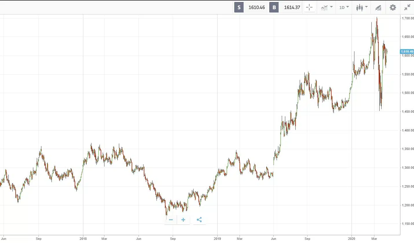 Zeker is dat de goudkopers tot dusver relatief ongedeerd zijn gebleven door de Corona-crisis. De prijs voor het gele edelmetaal steeg in het eerste kwartaal met circa vijf procent ondanks de incidentele zware verliezen. Goud kostte onlangs iets meer dan $ 1.600 per troy ounce (31,1 gram). Het edelmetaal werd in euro verhandeld voor 1485 euro per troy ounce.