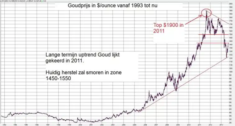 Maar laten we niet uit het oog verliezen dat die argumenten in het voordeel van de edelmetalen al lang en breed vertaald zijn in actuele ontwikkelingen. De goudprijs, meer dan een decennium lang kabbelend tussen grofweg $250 en 400, is vanaf 2002 (niet toevallig na het barsten van de ICT en Internetbubble) is een enorme hausse beland waarbij de waarde onophoudelijk opliep tot uiteindelijk een top van rond $1900 in 2011. Een korte hapering in het crisisjaar 2008 daargelaten, toen werkelijk alles van waarde (aandelen, obligaties, vastgoed) in de uitverkoop ging. Met uiteindelijk ongeveer een verzesvoudiging (!) van de goudprijs in een decennium tijd. Zou dit niet een rechtvaardige of zelfs geflatteerde verdiscontering zijn van de nieuwe economische werkelijkheid die zich na het barsten van de diverse bubbles in 2002 inzette, en zich via subprime-, banken- en schuldencrisis tot op de dag van vandaag voortzet? En zou het niet zo kunnen zijn dat de daling van de goudprijs vanaf 2011, van een top rond $1900 tot in juni dit jaar $1200 een nieuwe fase inluidt waarmee de hausse van 2002 tot 2011 is beëindigd?