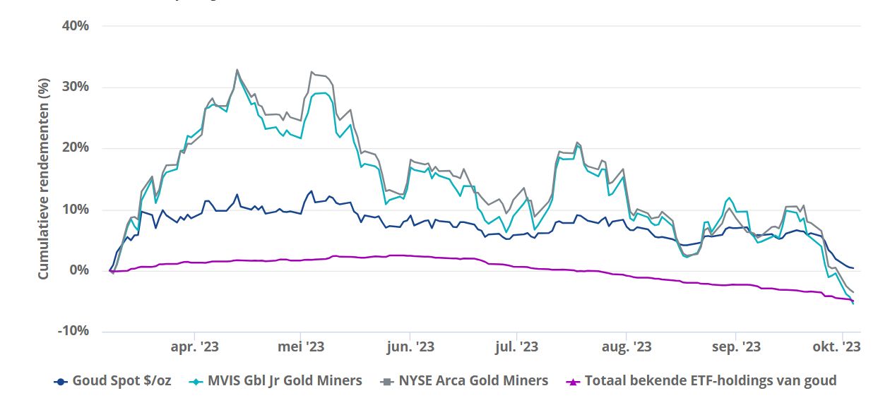 Bron: Bloomberg. Resultaten uit het verleden vormen geen garantie voor toekomstige resultaten. Alle reeksen worden weergegeven in USD. Rendementen zijn alleen prijsrendementen (exclusief dividenden). Elke lijn is herleid tot nul op 8 maart 2023. Er worden geen aannames voor valutahedging of hefboomwerking gedaan. beleggen brengt risico’s met zich mee, waaronder mogelijk verlies van de hoofdsom. De rendementen van een index zijn niet representatief voor de rendementen van een strategie. Het is niet mogelijk om in een index te beleggen.